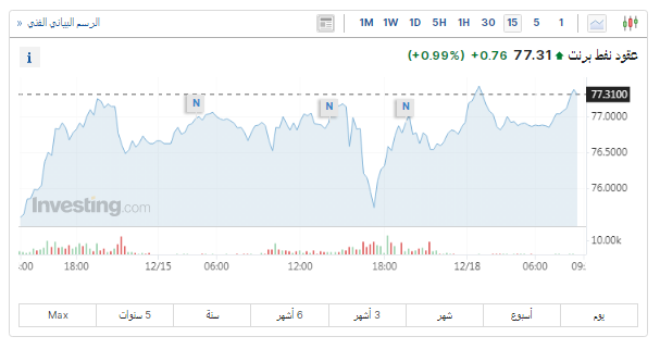 حيث نجد أن سعر عقود نفط برنت سجلت في الوقت الحالي من اليوم 18 ديسمبر 77.31 دولار أمريكي.