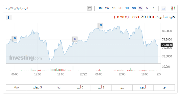 واليوم نوفر لكم سعر عقود نفط برنت والتي وصلت إلى 79.18 دولار أمريكي وبذلك نجد أنها هبطت بنسبة 0.26% عن سعر يوم أمس.