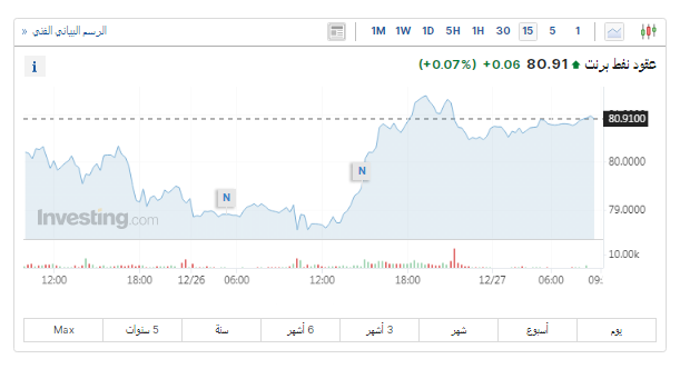 واليوم نجد ان سعر عقود نفط برنت هي 80.89 دولار أمريكي، وهذا يمثل زيادة بنسبة 0.05% عن سعر يوم أمس.
