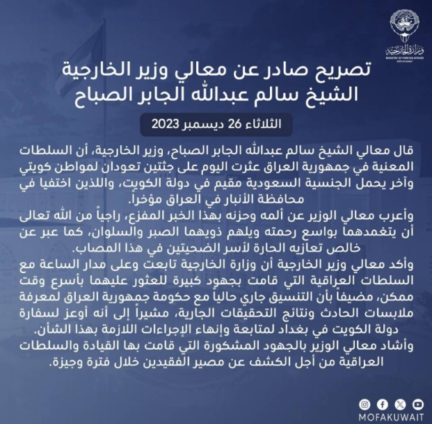 قامت وزارة الخارجية الكويتية اليوم الثلاثاء بإصدار بيان حول حادثة اختطاف مواطن كويتي ومواطن آخر سعودي وذلك في محافظة الأنبار بالعراق.