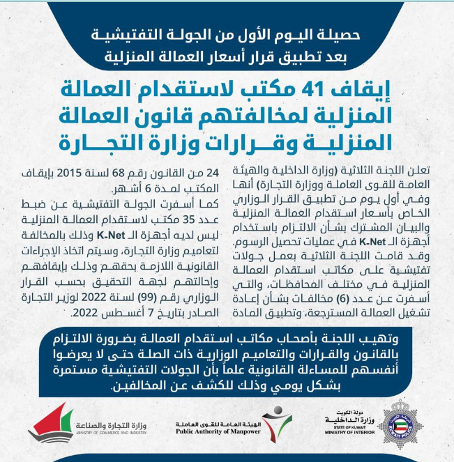في الكويت تم إيقاف 41 مكتب استقدام للعمالة المنزلية وذلك لأنهم قاموا بمخالفة قانون العمالة المنزلية وقد قامت وزارة التجارة بهذه الخطوة في أثناء إحدى الجولات التفتيشية.