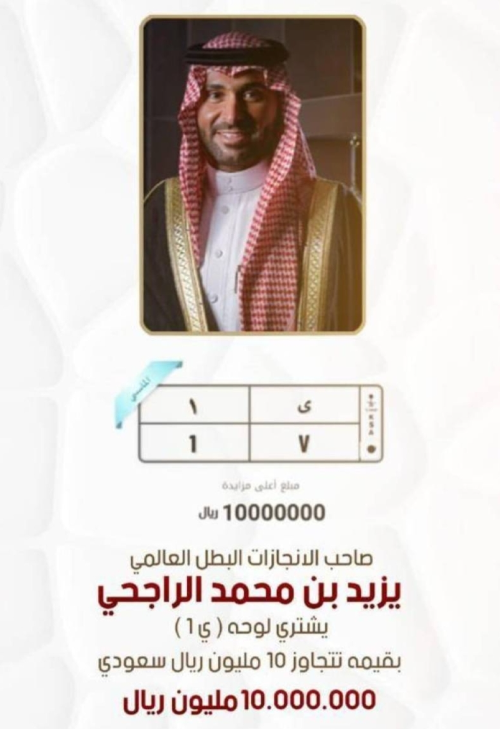 وقام الإعلامي محمد الدريم بالكشف عن تغريدة على الحساب الشخصي له على منصة إكس، وقال فيها: "صاحب الإنجازات و البطل العالمي، يزيد بن محمد الراجحي، يشتري لوحة " ي 1"، بقيمة تتجاوز الـ 10 مليون ريال سعودي".