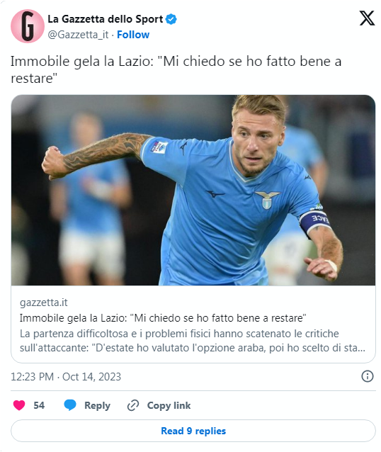 أعرب اللاعب الإيطالي "تشيرو إيمويبلي" مهاجم نادي لاتسيو عن حزنه وحسرته بعدما قام برفض عروض كان تلقاها خلال الميركاتو الصيفي الماضي لينتقل إلى اللعب داخل دوري روشن السعودي.