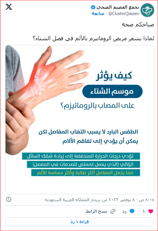 وقال "تجمع القصيم الصحي" نصًا على المنصة: "أن درجات الحرارة المنخفضة تؤدي إلى زيادة سمك السائل الزلالي (الذي يعمل كممتص لصدمات المفاصل)؛ ما يجعل المفاصل أكثر صلابة وحساسية للألم".