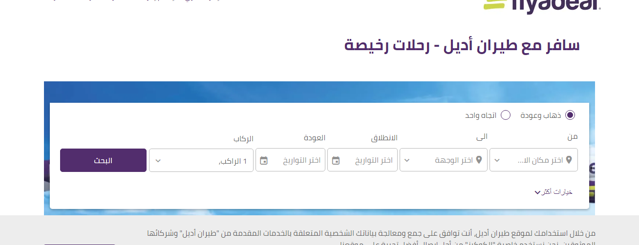 - ادخل بيانات حجز رحلة (مكان الانطلاق، ومكان الهبوط، وتاريخ العودة، وتاريخ الانطلاق، وعدد الركاب).