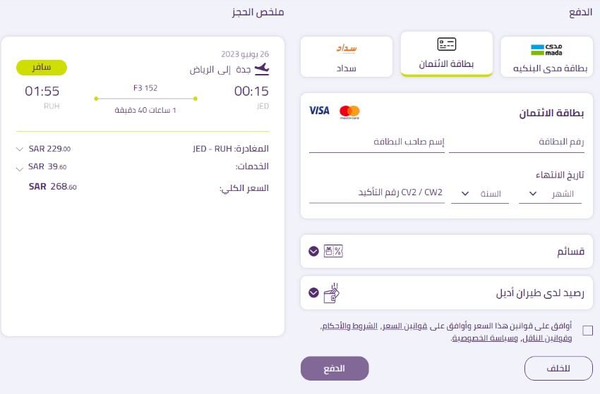 - ادخل بيانات الدفع (رقم البطاقة الإئتمانية، واسم صاحب البطاقة، وتاريخ انتهاء البطاقة، والرقم الموجود خلف البطاقة CVV).