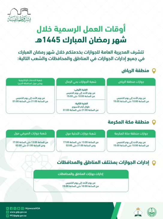 إذ كعادة الجهات الحكومية السعودية أنها تحاول التخفيف على العاملين لديها والموظفين في مختلف الوظائف من خلال الشهر الكريم، ومن هنا تأتي ضرورة تعديل مواعيد الدوام، وهنا قد كشفت الجوازات عن الخاصة به في مختلف الإدارات وهي ما جاءت على النحو التالي: