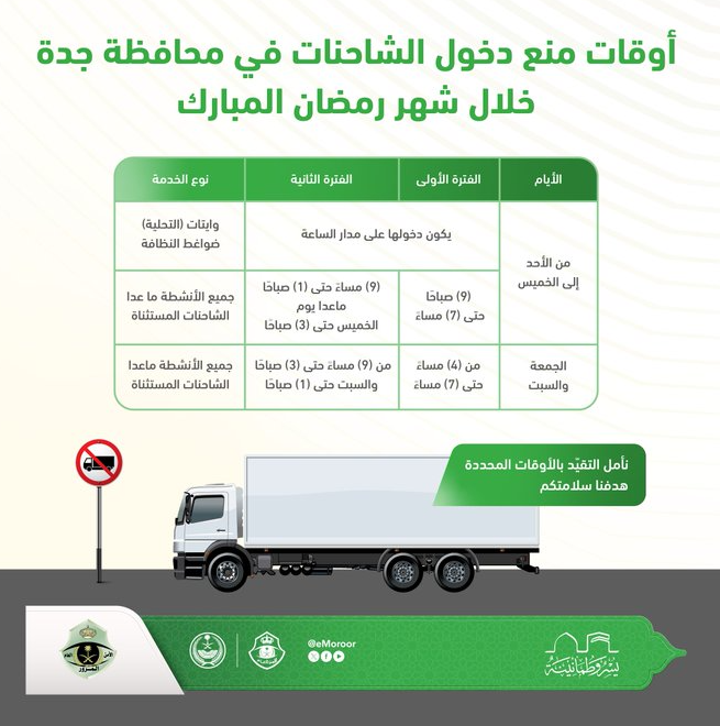تزامنًا مع بداية شهر رمضان المعظم قامت الإدارة العامة للمرور في المملكة العربية السعودية بالإعلان عن قيامها بتحديد مواعيد خاصة تسمح خلالها بدخول الشاحنات حسب نوع الخدمة التي تقدمها إلى عدد من المناطق في المملكة.