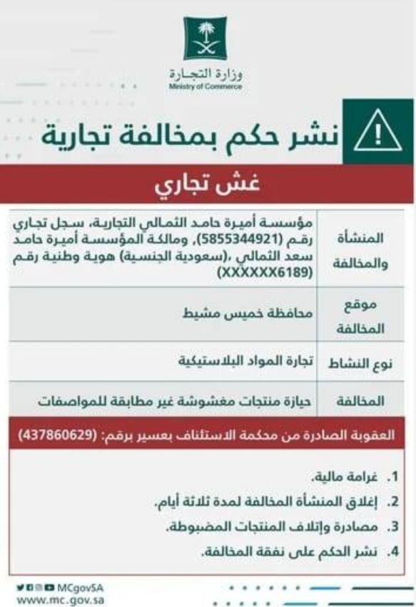 قامت وزارة التجارة بالتشهير بمؤسسة أميرة حامد الثمالي التجارية بمحافظة خميس مشيط، وكان هذا الأمر بعد أن صدر بحقها حكم قضائي مُدانة فيه وكذلك المؤسسة بمخالفة ظام مكافحة الغش التجاري.