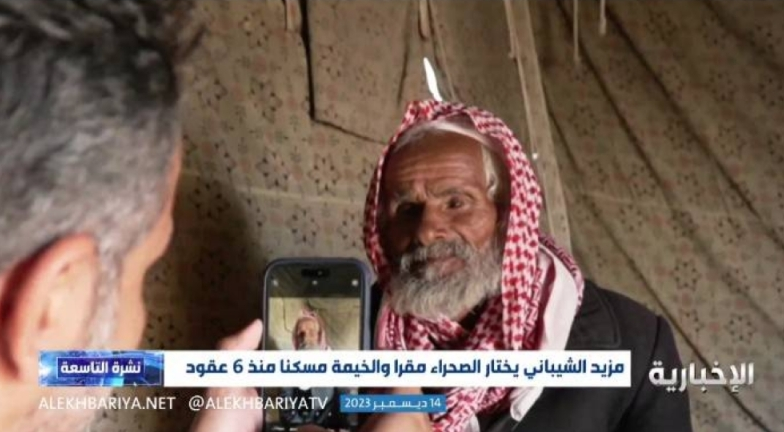 أوضحت قناة الإخبارية من خلال التقرير الذي قامت بنشره عن قصة المواطن المسن الذي يسمى "مزيد الشيباني" بعض المعلومات عنه، وهو المواطن الذي يعيش في صحراء عفيف.