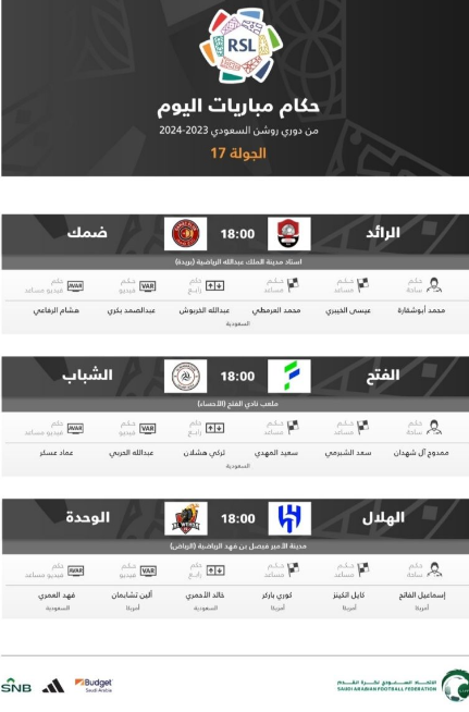 تبدأ منافسات الجولة الـ 17 من مسابقة دوري روشن السعودي للمحترفين اليوم الجمعة، وأعلنت لجنة الحكام بالاتحاد السعودي لكرة القدم عن حكام المباريات.